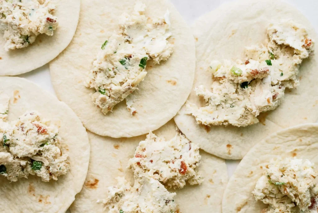- Assemble your taquitos. Take a tortilla and spoon about 2 tablespoons of the chicken-bacon-ranch mixture into the center. Roll it up tightly (think of it like rolling up a sleeping bag—firm, but not too firm). Place each taquito seam-side down on a baking sheet.