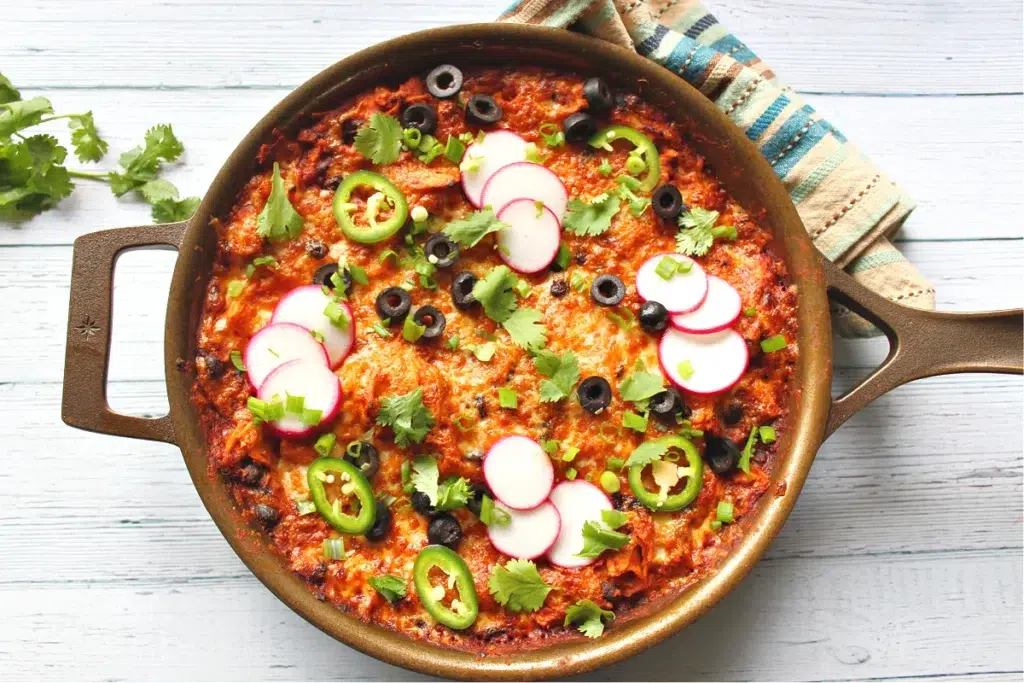 This skillet meal delivers a good balance of protein, fiber, and complex carbohydrates. Chicken provides lean protein to keep you full, while black beans support digestion and heart health. Corn and tomatoes add vitamins and antioxidants, and you can easily control sodium by choosing a low-sodium enchilada sauce. With a few smart choices, it’s comfort food that still feels nourishing.