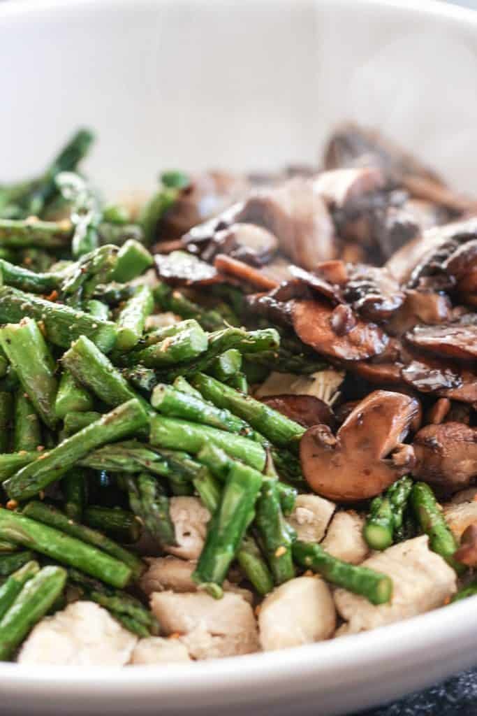1. Prep everything first. Slice the chicken thinly so it cooks fast. Chop mushrooms and asparagus into bite-sized pieces. Mince the garlic. Prep now, relax later—trust the process.