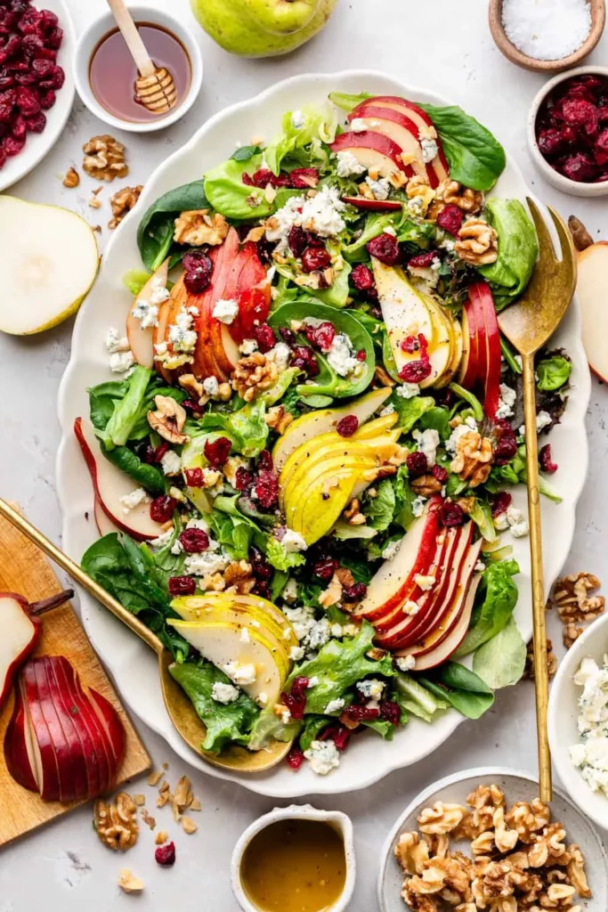 Pears are rich in fiber and antioxidants, supporting digestion. Walnuts provide healthy fats that are good for heart health. Leafy greens add vitamins and minerals without many calories. This salad is a nutritious choice that still feels indulgent.